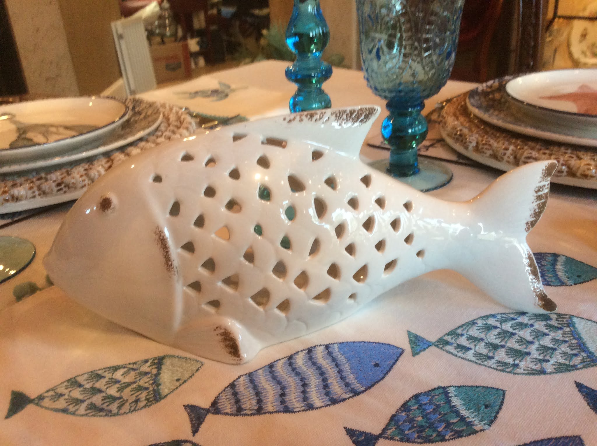 Both blue and white fish serve as votive candle holders to accent the centerpiece.
