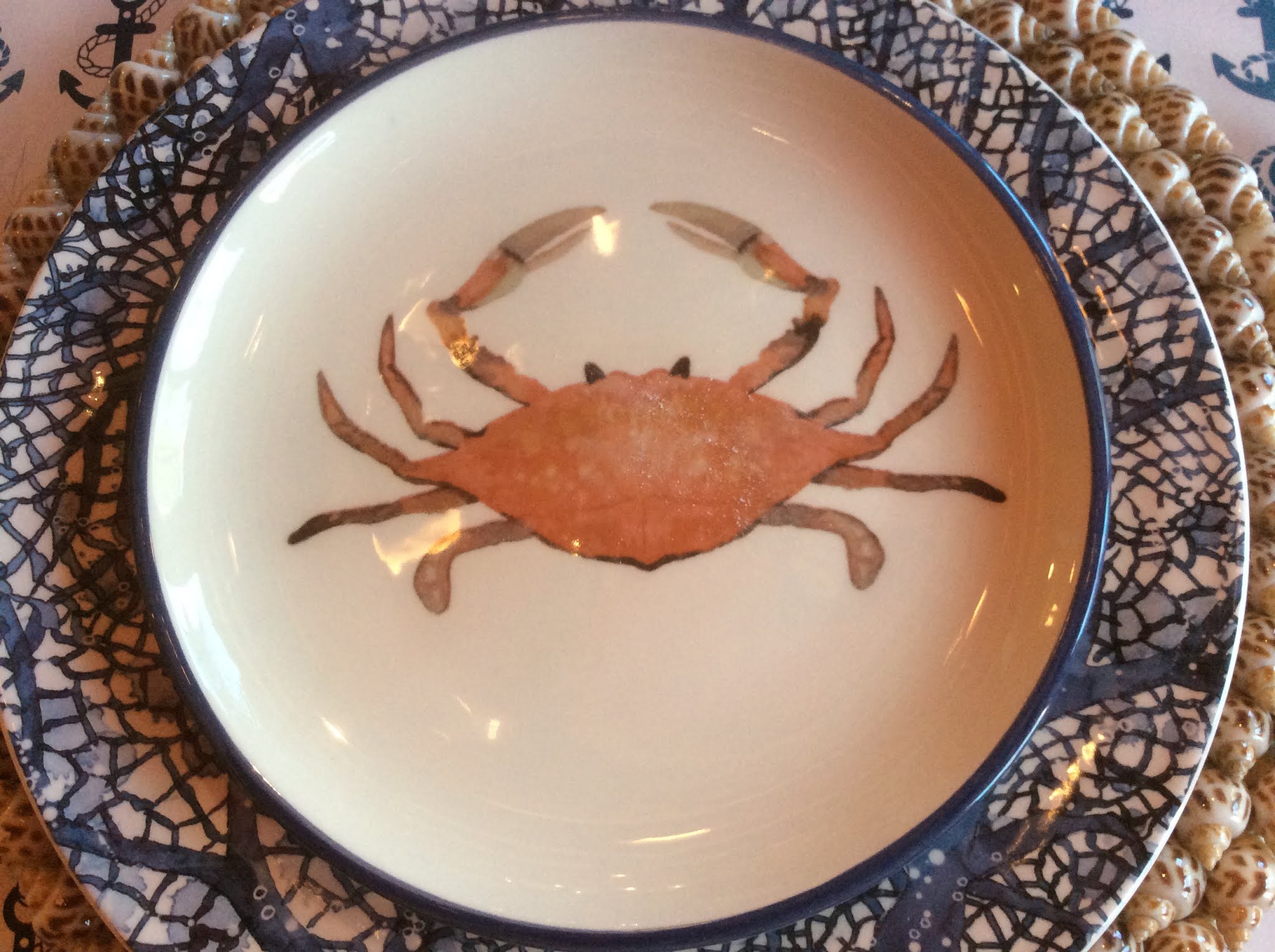 The cork place mats have blue anchors plus blue flatware.