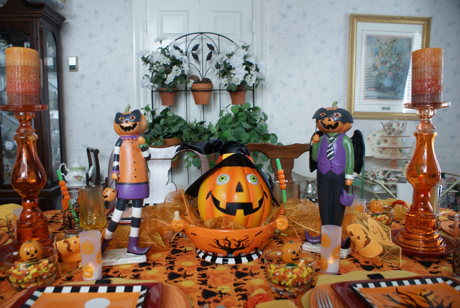 Wrapping Jack and Jackie is a sheer table runner decorated with more laughing and toothy Jack-o-lanterns.